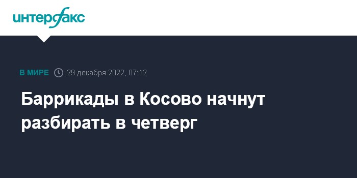 Москва. 29 декабря. INTERFAX.RU - Президент Сербии Александр Вучич заявил, что сербы начнут разбирать свои баррикады в Косово в четверг, что будет способствовать снижению уровня напряженности, которая могла привести к новым столкновениям на Балканах, сообщило агентство Associated Press.