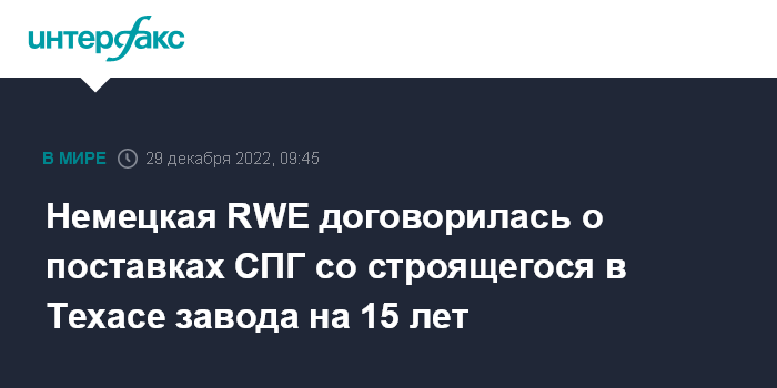 Москва. 29 декабря. INTERFAX.RU - Германская RWE Supply & Trading GmBH (подразделение RWE AG) заключила контракт с американской Sempra Infrastructure на поставки СПГ на 15 лет.