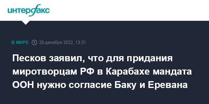 Песков заявил, что для придания миротворцам РФ в Карабахе мандата ООН нужно согласие Баку и Еревана