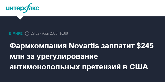 Москва. 29 декабря. INTERFAX.RU - Швейцарская фармкомпания Novartis AG достигла соглашения об урегулировании претензий, связанных с нарушающим конкуренцию поведением в США, пишет MarketWatch.