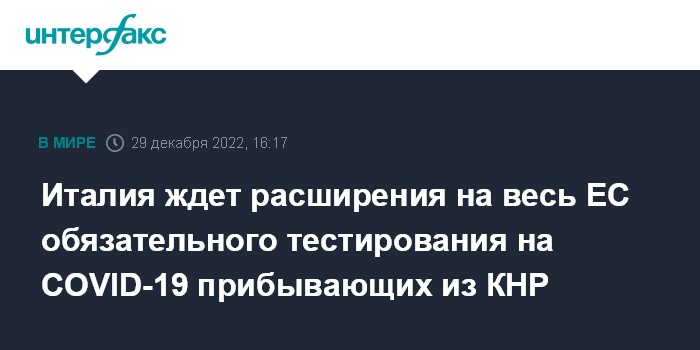 Москва. 29 декабря. INTERFAX.RU - Премьер-министр Италии Джорджа Мелони рассчитывает, что Евросоюз вслед за ее страной введет обязательное тестирование на коронавирус COVID-19 для прибывающих из Китая.