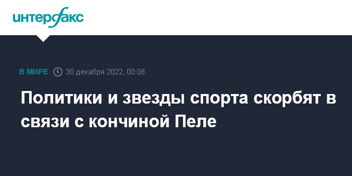 Москва. 30 декабря. INTERFAX.RU - Известные спортсмены и политики в четверг выражают скорбь в связи со смертью легендарного бразильского футболиста Пеле.