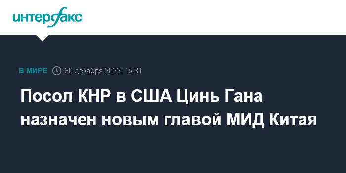 Москва. 30 декабря. INTERFAX.RU - Власти КНР выбрали посла Китая в США Цинь Гана новым главой внешнеполитического ведомства, передает CGTN.