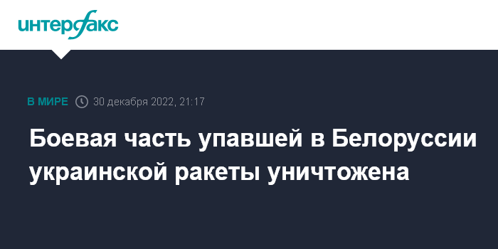 Москва. 30 декабря. INTERFAX.RU - В Белоруссии уничтожили боевую часть упавшей на территории республики ракеты, выпущенной с территории Украины, сообщает в пятницу госагентство БелТА.