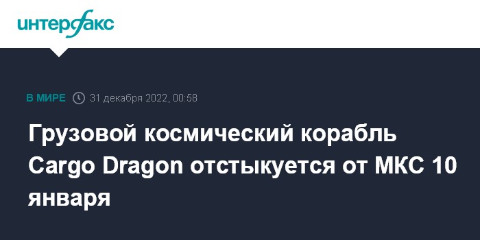 Москва. 31 декабря. INTERFAX.RU - Многоразовый грузовой космический корабль Cargo Dragon американской компании SpaceX отстыкуется от Международной космической станции (МКС) 10 января для возвращения на Землю, сообщило Национальное управление США по аэронавтике и исследованию космического пространства (NASA).