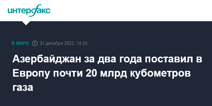 Москва. 31 декабря. INTERFAX.RU - Азербайджан с 31 декабря 2020 года экспортировал в Европу по Транс-Адриатическому газопроводу (TAP) более 19,4 млрд кубометров газа, сообщил в соцсетях министр энергетики Азербайджана Пярвиз Шахбазов.
