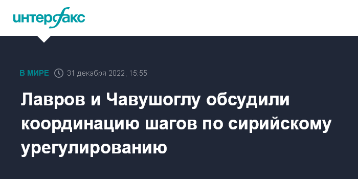 Москва. 31 декабря. INTERFAX.RU - Главы МИД России и Турции Сергей Лавров и Мевлют Чавушоглу обсудили по телефону координацию шагов по вопросам сирийского урегулирования, сообщило российское внешнеполитическое ведомство.