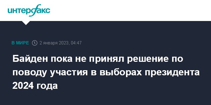 Москва. 2 января. INTERFAX.RU - Президент США Джо Байден пока не принял решение о том, будет ли он добиваться переизбрания на занимаемый им пост, пишет издание Politico, которое ссылается на частные беседы с осведомленными источниками.