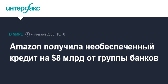 Москва. 4 января. INTERFAX.RU - Amazon.com Inc получила необеспеченный кредит от группы банков на сумму $8 млрд, средства которого планирует направить на финансирование общекорпоративных целей.