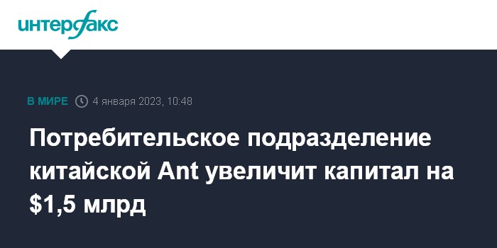 Москва. 4 января. INTERFAX.RU - Подразделение китайской финтех-компании Ant Group в сфере потребительского финансирования – Chongqing Ant Consumer Finance Co. – получило разрешение регуляторов на привлечение нового капитала на сумму $1,5 млрд.