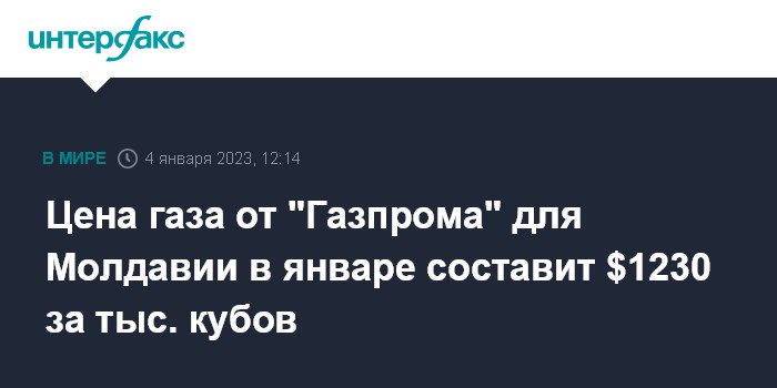 Москва. 4 января. INTERFAX.RU - Цена газа от ПАО "Газпром" для Молдавии в январе составит около $1230 за тысячу кубов, но весь объем газа будет поставляться в Приднестровье. Об этом сообщил председатель правления АО "Молдовагаз" Вадим Чебан в среду в своем telegram-канале.