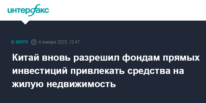 Москва. 4 января. INTERFAX.RU - Власти Китая вновь разрешили фондам прямых инвестиций привлекать средства на реализацию проектов в сфере жилой недвижимости, сообщает агентство Bloomberg.