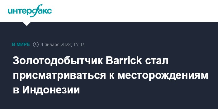 Москва. 4 января. INTERFAX.RU - Barrick Gold, один из крупнейших мировых золотодобытчиков, ищет месторождения золота и меди в Южной Азии и рассматривает Индонезию как возможное направление для геологоразведки.