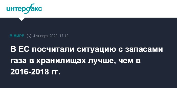 Москва. 4 января. INTERFAX.RU - В Еврокомиссии (ЕК) положение с запасами газа в хранилищах государств-членов ЕС считают благоприятным при показателе выше 80%, заявила официальный представитель ЕК Дана Спинант.