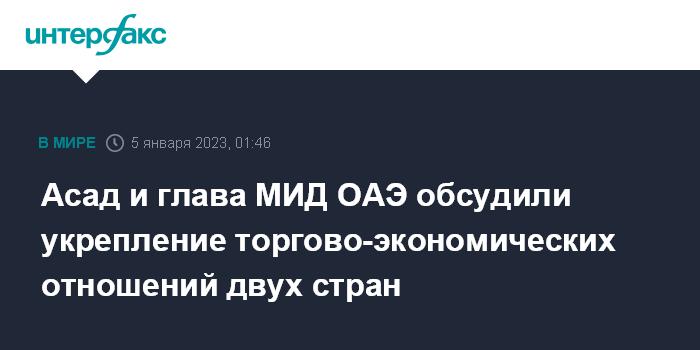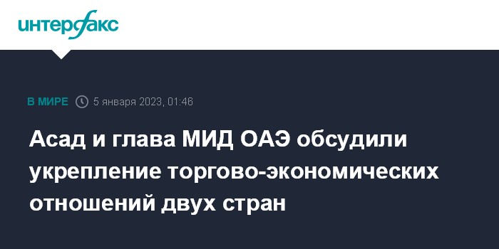 Москва. 5 января. INTERFAX.RU - Президент Сирии Башар Асад в среду обсудил с главой МИД ОАЭ шейхом Абдаллой бин Зайед Аль Нахьяном двустороннее сотрудничество в ряде сфер и укрепление экономических отношений, передает агентство САНА.
