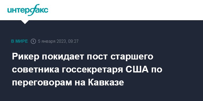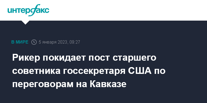 Москва. 5 января. INTERFAX.RU - Посол Филип Рикер покидает пост старшего советника госсекретаря США по переговорам на Кавказе и оставляет дипломатическую службу с 5 января, сообщил спикер госдепа Нед Прайс на брифинге.