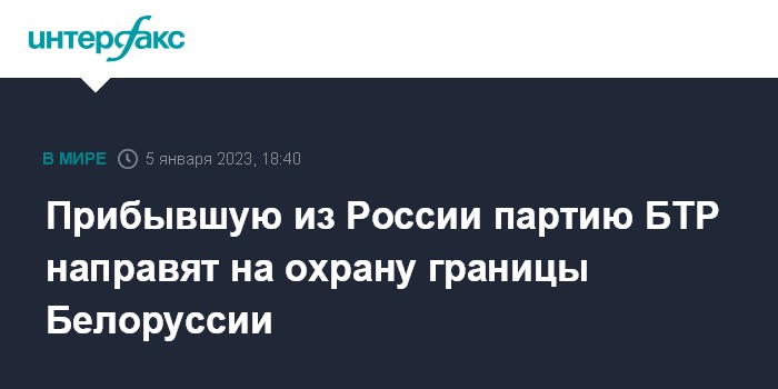 Москва. 5 января. INTERFAX.RU - Прибывшая в четверг из России новая партия БТР будет направлена на охрану границы Белоруссии, сообщили в Минобороны республики.