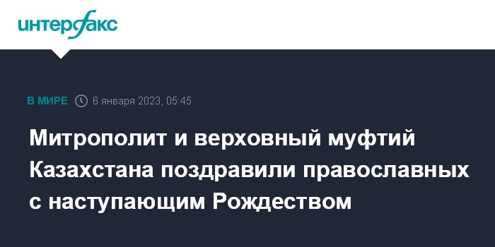 Москва. 6 января. INTERFAX.RU - Глава православной церкви Казахстана, митрополит Астанайский и Казахстанский Александр и председатель Духовного управления мусульман Казахстана (ДУМК), верховный муфтий Наурызбай хаджи Таганулы поздравили православных граждан республики с наступающим праздником Рождества Христова.