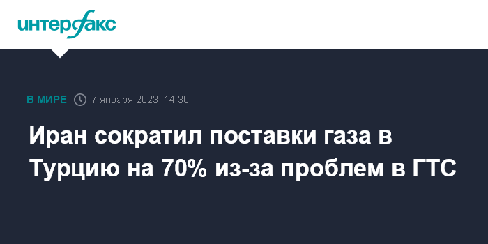 Москва. 7 января. INTERFAX.RU - Поставки иранского газа в Турцию с 1 января 2023 года сократились на 70% по отношению к плану из-за неисправности в иранской газотранспортной системе (ГТС), сообщает турецкая государственная компания Botas.