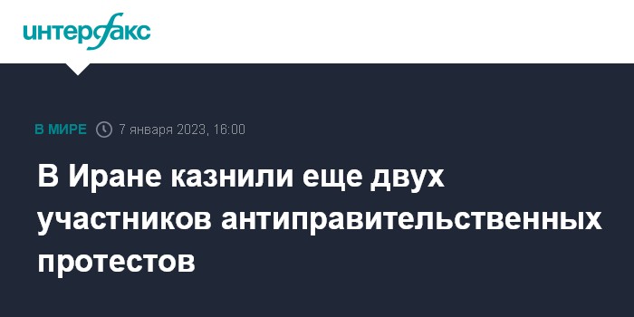 Москва. 7 января. INTERFAX.RU - Судебные власти Ирана сообщили в субботу о казни двух демонстрантов, признанных виновными в убийстве добровольца из военизированного формирования "Басидж", сообщает Associated Press.