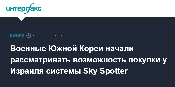 Москва. 8 января. INTERFAX.RU - Южнокорейские военные рассматривают возможность покупки израильской системы Sky Spotter для укрепления своих возможностей по обнаружению северокорейских беспилотных летательных аппаратов, сообщило в воскресенье агентство "Ренхап" со ссылкой на источник в министерстве обороны страны.