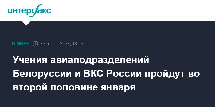 Москва. 8 января. INTERFAX.RU - Совместное авиационное учение Белоруссии и России пройдет с 16 января по 1 февраля, сообщила в воскресенье пресс-служба белорусского Минобороны.