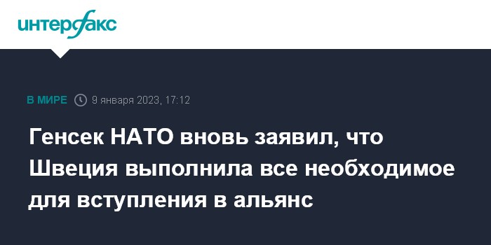 Москва. 9 января. INTERFAX.RU - Генсек НАТО Йенс Столтенберг вновь заявил, что Швеция выполнила все необходимые требования для вступления в альянс, и потому нужно завершить процесс ратификации ее членства.