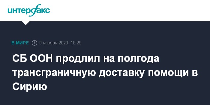 Москва. 9 января. INTERFAX.RU - Члены Совета Безопасности ООН в понедельник приняли резолюцию по продлению на полгода действия механизма трансграничной доставки гуманитарной помощи в Сирию.