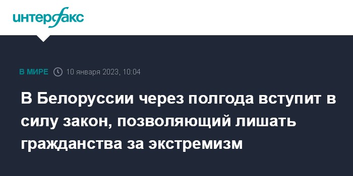 Москва. 10 января. INTERFAX.RU - В Белоруссии во вторник на Национальном правовом интернет-портале опубликованы изменения в закон "О гражданстве Республики Беларусь", которые позволяют лишать гражданства за причастность к экстремистской деятельности и причинение тяжкого вреда интересам государства.
