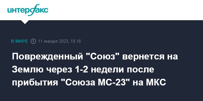 Москва. 11 января. INTERFAX.RU - Поврежденный корабль "Союз МС-22" отстыкуется от Международной космической станции (МКС) спустя одну-две недели после прибытия к ней "Союза МС-23", сообщил исполнительный директор "Роскосмоса" по пилотируемым космическим программам Сергей Крикалев.