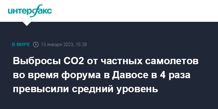 Москва. 13 января. INTERFAX.RU - Объем выбросов углекислого газа от частных самолетов во время проведения Всемирного экономического форума в Давосе в прошлом году был в несколько раз выше, чем в среднем по городу в остальное время, сообщают европейские СМИ со ссылкой на исследование нидерландской консалтинговой компании CE Delft.