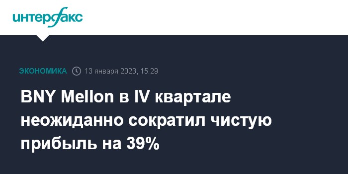 Москва. 13 января. INTERFAX.RU - Bank of New York Mellon, крупнейший в мире банк-кастодиан, сократил чистую прибыль в четвертом квартале на 39%, что стало неожиданностью для аналитиков.