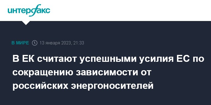 Москва. 13 января. INTERFAX.RU - Глава Еврокомиссии (ЕК) Урсула фон дер Ляйен считает, что усилия ЕС по снижению энергетической зависимости от России увенчались успехом.