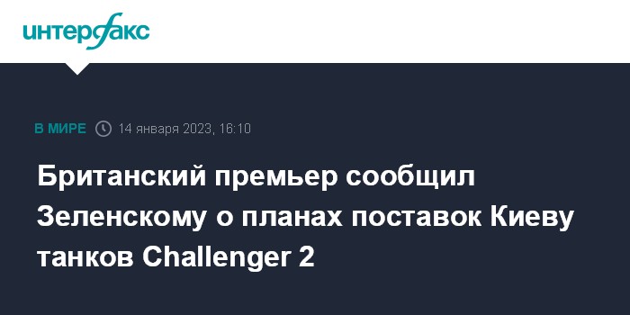Москва. 14 января. INTERFAX.RU - Премьер Великобритании Риши Сунак в ходе телефонного разговора с президентом Украины Владимиром Зеленским сообщил о планах передать Украине танки Challenger 2, сообщает Даунинг-стрит.