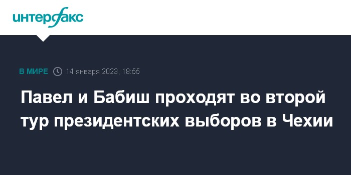 Москва. 14 января. INTERFAX.RU - Бывший премьер Чехии Андрей Бабиш и экс-председатель военного комитета НАТО Петр Павел проходят во второй тур президентских выборов, сообщает в субботу агентство EFE со ссылкой на результаты подсчета 80% бюллетеней.