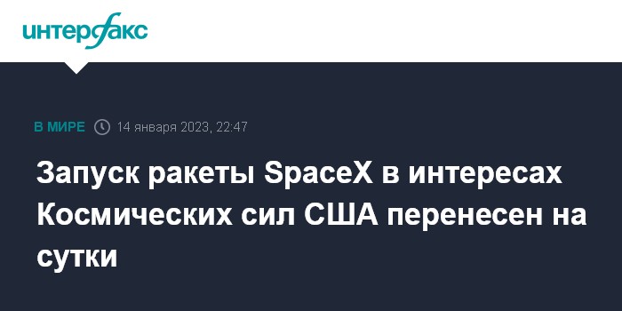 Москва. 14 января. INTERFAX.RU - Запуск американской тяжелой ракеты Falcon Heavy с миссией USSF-67 в интересах Космических сил США, запланированный на воскресенье по московскому времени, перенесен на сутки, сообщила компания-разработчик носителя SpaceX.