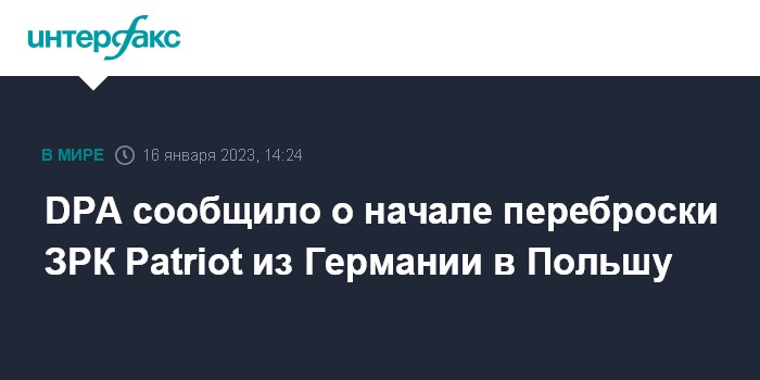 Москва. 16 января. INTERFAX.RU - Бундесвер приступил к передислокации ряда зенитных ракетных комплексов (ЗРК) Patriot и обслуживающего их персонала в Польшу, сообщило агентство DPA со ссылкой на источники в силовых структурах Германии.
