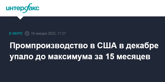Москва. 18 января. INTERFAX.RU - Объем промышленного производства в США в декабре упал на 0,7% по сравнению с предыдущим месяцем, рекордными темпами за 15 месяцев, свидетельствуют данные Федеральной резервной системы.