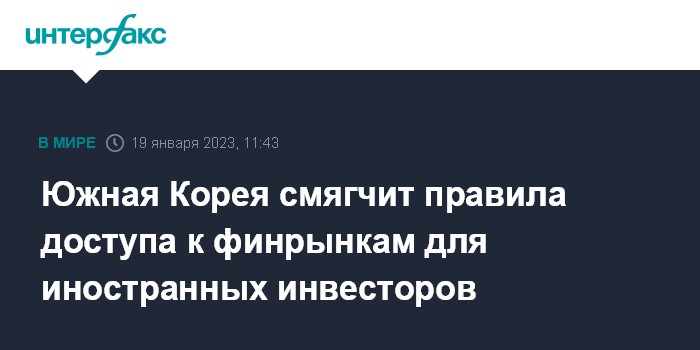 Москва. 19 января. INTERFAX.RU - Южная Корея смягчит правила доступа иностранных инвесторов к ее финансовым рынкам, рассчитывая, что это поможет стране в получении статуса развитой экономики от индексного провайдера MSCI.