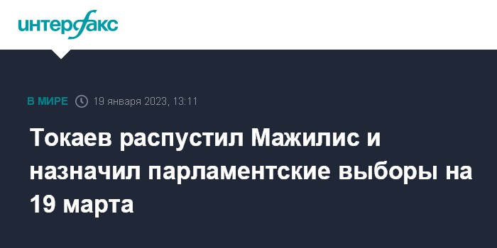 Москва. 19 января. INTERFAX.RU - Президент Казахстана Касым-Жомарт Токаев своим указом распустил нижнюю палату парламента - Мажилис, и назначил внеочередные выборы на 19 марта.