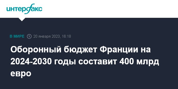 "Тогда как закон военного планирования на 2019-2024 годы был рассчитан на 295 млрд евро, могу теперь вам сказать, что я запрошу законодателей, чтобы мы смогли иметь в период 2024-2030 годов бюджетное финансирование в 400 млрд евро", - сказал Макрон, выступая в пятницу на базе ВВС в Мон-де-Марсан.