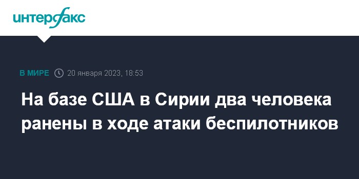 Москва. 20 января. INTERFAX.RU - В сирийской провинции Хомс три беспилотника атаковали базу "Эт-Танф" международной коалиции, которую возглавляют США, два человека были ранены, сообщили в Центральном командовании ВС США.