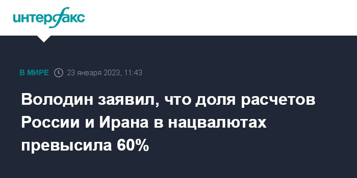 Москва. 23 января. INTERFAX.RU - Сейчас доля рубля и риала во взаиморасчетах между Россией и Ираном превышает 60 процентов, заявил председатель Госдумы Вячеслав Володин на встрече со спикером Собрания Исламского Совета Ирана Мохаммадом Багером Галибафом.