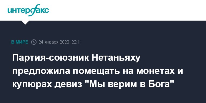 "Законодатели из ультрарелигиозной партии "Шас", ключевого союзника премьера Биньямина Нетаньяху, предложили законопроект о помещении надписи "Мы верим в Бога" на все законные платежные средства Банка Израиля", - сообщает во вторник израильское издание "Едиот ахронот".