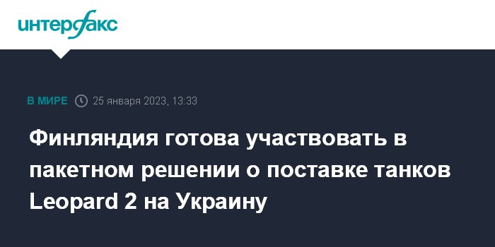 Москва. 25 января. INTERFAX.RU - Финляндия готова принять участие в той или иной мере в пакетном решении о поставке танков Leopard 2 на Украину, заявил министр иностранных дел страны Пекка Хаависто в среду на пресс-конференции в Риге, сообщает финская газета Helsingin Sanomat.