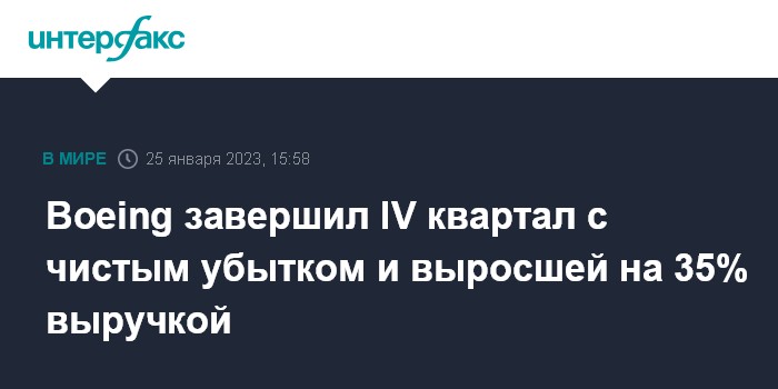 Москва. 25 января. INTERFAX.RU - Американский концерн Boeing, один из крупнейших мировых производителей авиационной, космической и военной техники, завершил четвертый квартал с убытком при повышении выручки на 35%.