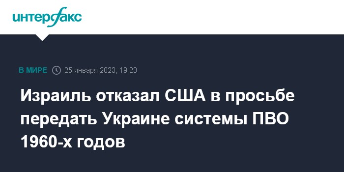 Москва. 25 января. INTERFAX.RU - США обратились к Израилю с просьбой направить Украине системы ПВО MIM-23 Hawk, снятые с вооружения и отправленные на склады, сообщает в среду Axios со ссылкой на представителей американских и израильских властей.
