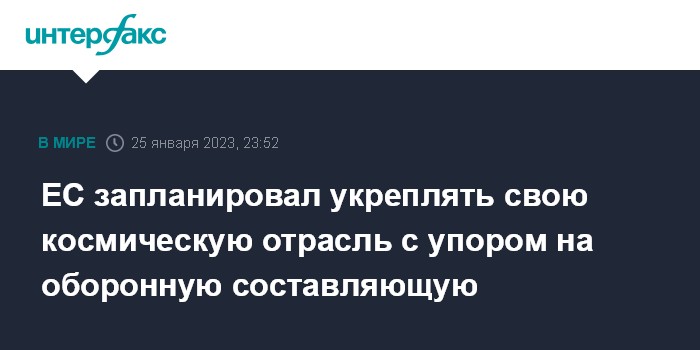 Москва. 25 января. INTERFAX.RU - Европейский союз нуждается в укреплении и развитии своей космической отрасли и в области космической безопасности будет сотрудничать со своими партнерами, прежде всего с НАТО, заявил глава дипломатии ЕС Жозеп Боррель.