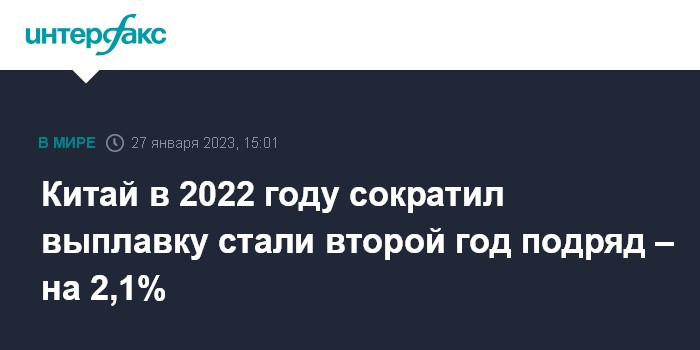 Москва. 27 января. INTERFAX.RU - Китай в 2022 году снизил выплавку стали по итогам второго года подряд.