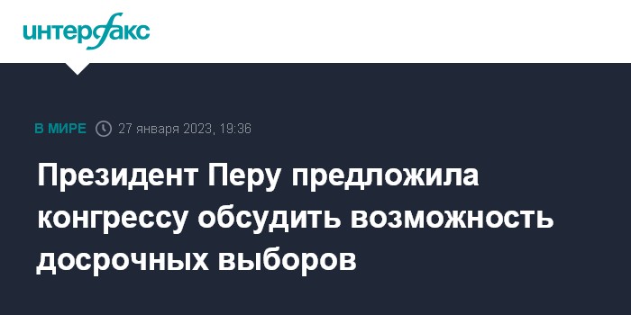 Москва. 27 января. INTERFAX.RU - Президент Перу Дина Болуарте в пятницу обратилась к конгрессу (парламенту страны) с предложением, чтобы досрочные выборы в стране состоялись в течение 2023 года.